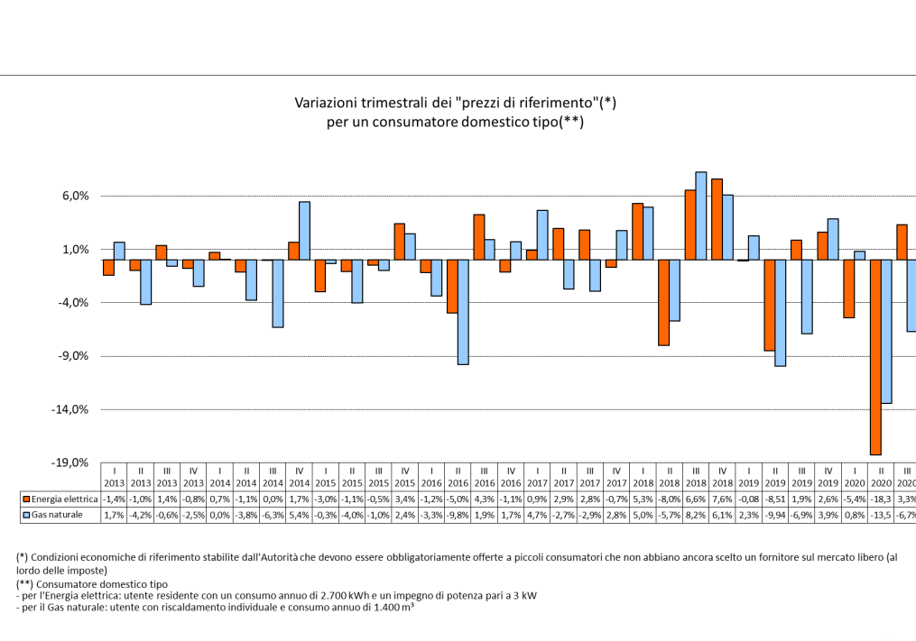 Dopo i forti ribassi del secondo trimestre, dal 1° luglio 2020 per la famiglia tipo in tutela, ovvero quella che ha consumi medi di energia elettrica di 2.700 kWh all’anno e una potenza impegnata di 3 kW, si registra una flessione del 6,7% della bolletta del gas, ma un rialzo per la bolletta dell’elettricità, con un +3,3%.